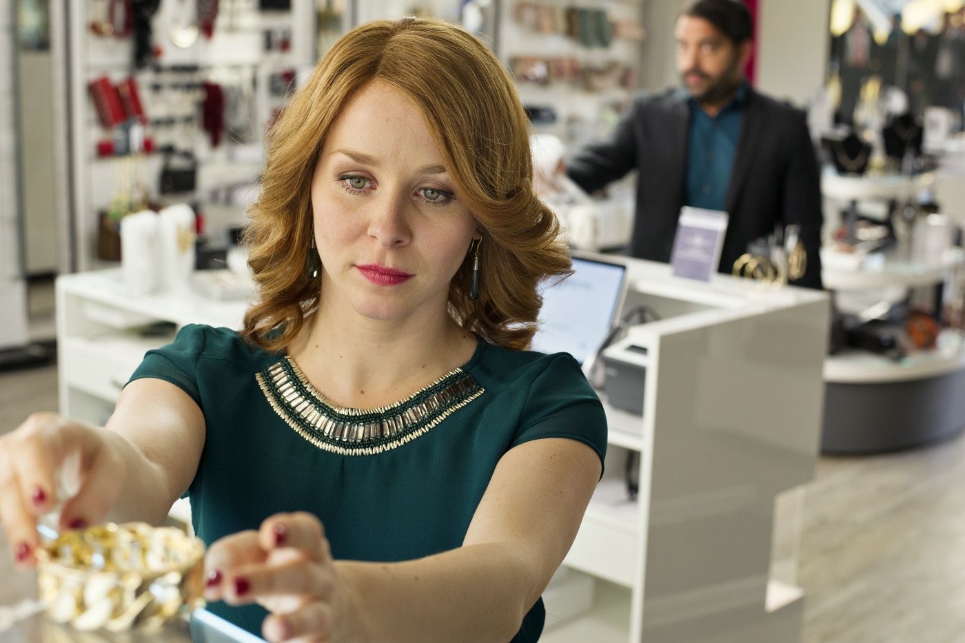 Marion (Jasmin Schwiers) bekommt während der Arbeit Besuch von einem kleinlauten Aykut (Serkan Çetinkaya).