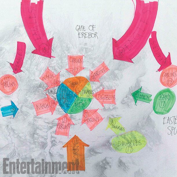 Außerdem veröffentlichte das Online-Magazin zwei Konzeptbilder zur Schlacht und einen Kampfplan, die ihr in der obigen Bildergalerie seht. Auf Letzterem sind die verschiedenen Parteien eingezeichnet, so zum Beispiel die Menschen um Bard (Luke Evans), die Zwerge nebst Thorin Eichenschild (Richard Armitage), Elben und die attackierenden Goblins (eine Unterart der Orks), Warge und aus der Luft schreiten die Adler ("Eagles") ein.