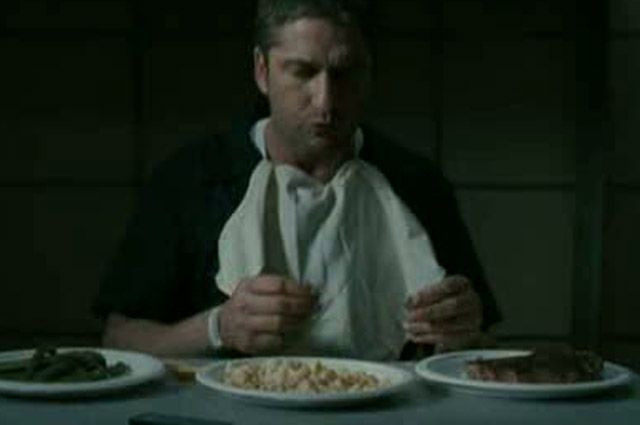 Aus: „Gesetz der Rache“ (F. Gary Gray, USA 2009) Ein T-Bone-Steak ist nicht nur köstlich. Die Form des namensgebenden Knochens eignet sich auch perfekt als Mordwerkzeug – spitz und griffig. So langsam wird es unheimlich mit dem tödlichen Essen…
