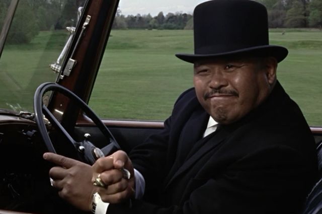 Aus: „James Bond 007 – Goldfinger“ (Guy Hamilton, Großbritannien 1964) Fiesling Oddjob (Harold Sakata) ist nicht nur schick, sondern auch tödlich gekleidet. Was das bedeutet, zeigt sein Hut: Dieser ist nämlich mit einem rasiermesserscharfem Metallrand ausgestattet worden, was ihn zu einem verheerenden Wurfgeschoss macht, wie eine unschuldige Skulptur am eigenen Leib erfahren muss.