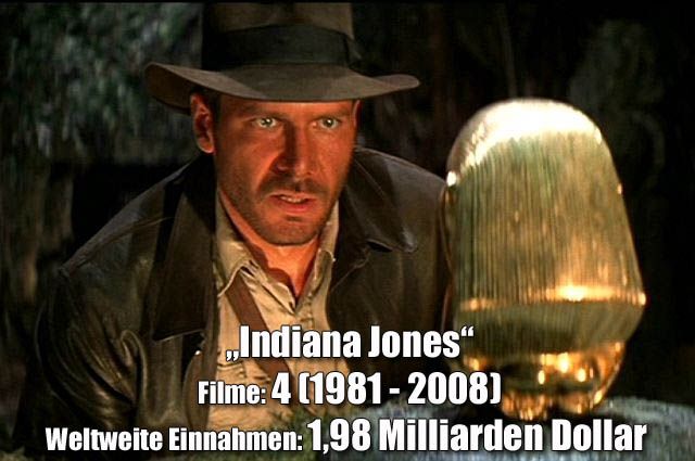 Platz 19 „Indiana Jones“ Gesamtes Einspielergebnis (weltweit): 1.983.736.193 $ Durchschnittliches Einspielergebnis (weltweit): 495.934.048 $ FILME (4): „Jäger des verlorenen Schatzes“: 389.925.971 $ „Indiana Jones und der Tempel des Todes“: 333.080.271 $ „Indiana Jones und der letzte Kreuzzug“: 474.171.806 $ „Indiana Jones und das Königreich des Kristallschädels": 786.558.145 $