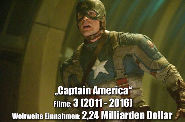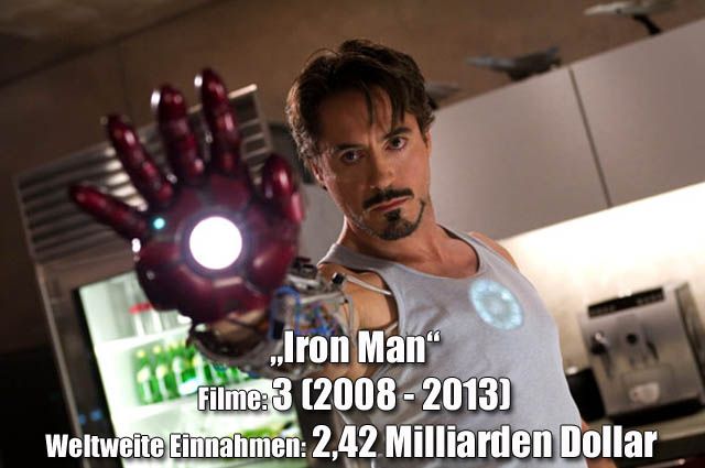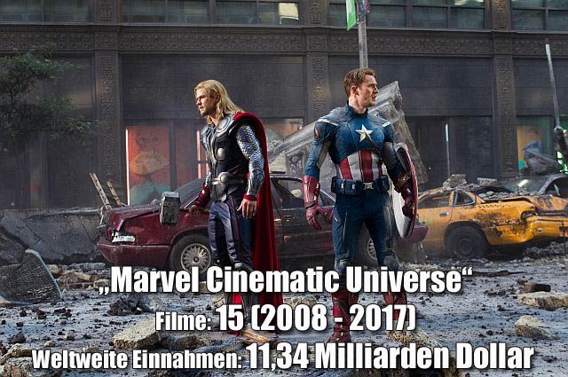 Platz 2 „Das neue Marvel-Universum“ Gesamtes Einspielergebnis (weltweit): 7.094.783.335 $ Durchschnittliches Einspielergebnis (weltweit): 709.478.334 $ FILME (10): „Iron Man“: 582.443.128 $ „Der unglaubliche Hulk“: 263.417.913 $ „Iron Man 2“: 623.561.331 $ „Thor“: 449.326.618 $ „Captain America: The First Avenger“: 370.569.783 $ „The Avengers“: 1.514.279.552 $ „Iron Man 3“: 1.172.805.920 $ „Thor - The Dark Kingdom“: 633.360.018 $ „The Return Of The First Avenger“: 713.846.960 $ „Guardians Of The Galaxy“: 771.172.112 $