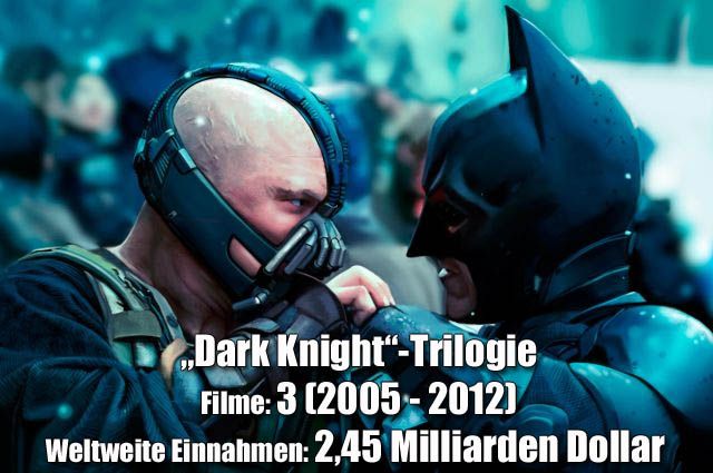 Platz 9 „Batman“ Gesamtes Einspielergebnis (weltweit): 3.700.015.594 $ Durchschnittliches Einspielergebnis (weltweit): 462.501.949 $ FILME (8): „Batman“: 411.348.924 $ „Batmans Rückkehr“: 266.824.291 $ „Batman und das Phantom“: 5.617.391 $ „Batman Forever”: 336.529.144 $ „Batman & Robin”: 238.317.814 $ „Batman Begins”: 359.142.724 $ „The Dark Knight”: 1.002.891.358 $ „The Dark Knight Rises”: 1.079.343.948 $