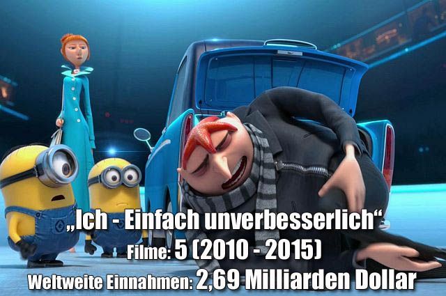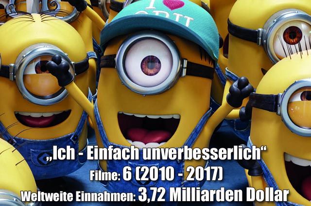 Platz 27 „Ich - Einfach unverbesserlich“ Gesamtes Einspielergebnis (weltweit): 1.518.253.875 $ Durchschnittliches Einspielergebnis (weltweit): 759.126.938 $ FILME (2): „Ich - Einfach unverbesserlich“: 543.495.033 $ „Ich - Einfach unverbesserlich 2“: 974.758.842 $