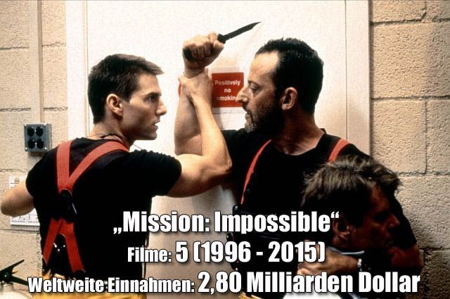 Platz 18 „Mission: Impossible“ Gesamtes Einspielergebnis (weltweit): 2.099.501.089 $ Durchschnittliches Einspielergebnis (weltweit): 524.875.272 $ FILME (4): „Mission: Impossible“: 457.697.994 $ „Mission: Impossible II“: 549.588.516 $ „Mission: Impossible III“: 397.501.348 $ „Mission: Impossible - Phantom Protokoll”: 694.713.231 $