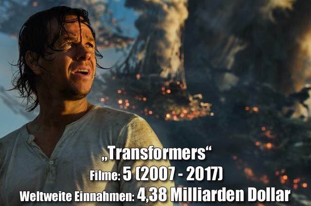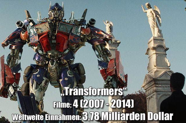Platz 7 „Transformers“ Gesamtes Einspielergebnis (weltweit): 3.749.725.445 $ Durchschnittliches Einspielergebnis (weltweit): 937.431.361 $ FILME (4): „Transformers“: 708.272.592 $ „Transformers - Die Rache“: 836.519.701 $ „Transformers 3“: 1.123.794.076 $ „Transformers - Ära des Untergangs“: 1.081.139.076 $