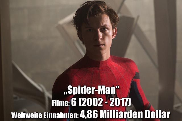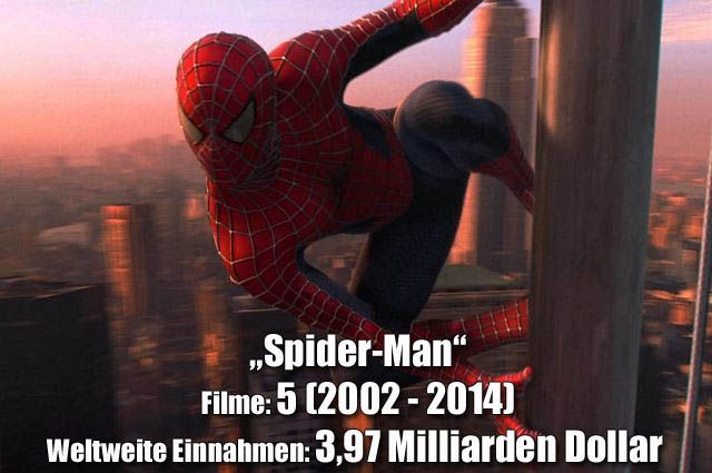 Platz 6 „Spider-Man“ Gesamtes Einspielergebnis (weltweit): 3.951.409.817 $ Durchschnittliches Einspielergebnis (weltweit): 790.281.963 $ FILME (5): „Spider-Man“: 809.942.906 $ „Spider-Man 2“: 783.705.001 $ „Spider-Man 3“: 890.875.304 $ „The Amazing Spider-Man“: 757.890.267 $ „The Amazing Spider-Man 2: Rise Of Electro“: 708.996.339 $