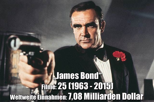 Platz 3 „James Bond“ Gesamtes Einspielergebnis (weltweit): 6.198.308.384 $ Durchschnittliches Einspielergebnis (weltweit): 258.262.849 $ FILME (24): „James Bond jagt Dr. No“: 59.567.035 $ „Liebesgrüße aus Moskau“: 78.900.000 $ „Goldfinger“: 124.900.000 $ „Feuerball“: 141.200.000 $ „Man lebt nur zweimal“: 111.600.000 $ „Im Geheimdienst ihrer Majestät“: 82.000.000 $ „Diamantenfieber“: 116.000.000 $ „Leben und Sterben lassen“: 161.800.000 $ „Der Mann mit dem goldenen Colt“: 97.600.000 $ „Der Spion, der mich liebte“: 185.400.000 $ „Moonraker“: 210.300.000 $ „In tödlicher Mission“: 195.300.000 $ „Octopussy“: 187.500.000 $ „Sag niemals nie“: 160.000.000 $ „Im Angesicht des Todes“: 152.627.960 $ „Der Hauch des Todes“: 191.200.000 $ „Lizenz zum Töten“: 156.167.015 $ „GoldenEye“: 356.429.941 $ „Der Morgen stirbt nie“: 339.504.276 $ „Die Welt ist nicht genug“: 361.730.660 $ „Stirb an einem anderen Tag“: 431.942.139 $ „Casino Royale“: 594.420.283 $ „Ein Quantum Trost“: 591.692.083 $ „Skyfall“: 1.110.526.992 $