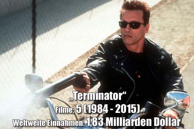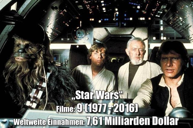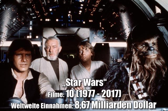Platz 5 „Star Wars“ Gesamtes Einspielergebnis (weltweit): 4.486.206.587 $ Durchschnittliches Einspielergebnis (weltweit): 640.886.655 $ FILME (7): „Krieg der Sterne“: 797.900.000 $ „Das Imperium schlägt zurück“: 534.171.960 $ „Die Rückkehr der Jedi-Ritter“: 572.700.000 $ „Star Wars: Episode I - Die dunkle Bedrohung“: 1.007.044.677 $ „Star Wars: Episode II - Der Angriff der Klonkrieger“: 656.695.615 $ „Star Wars: Episode III - Die Rache der Sith“: 848.998.892 $ „Star Wars: The Clone Wars“: 68.695.443 $