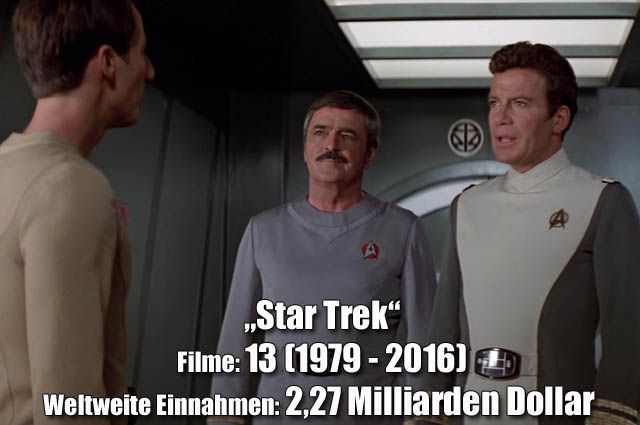Platz 21 „Star Trek“ Gesamtes Einspielergebnis (weltweit): 1.930.671.933 $ Durchschnittliches Einspielergebnis (weltweit): 160.889.328 $ FILME (12): „Star Trek - Der Film“: 139.000.000 $ „Star Trek - Der Zorn des Khan“: 96.800.000 $ „Star Trek - Auf der Suche nach Mr. Spock“: 87.000.000 $ „Star Trek - Zurück in die Gegenwart”: 133.000.000 $ „Star Trek - Am Rande des Universums”: 70.200.000 $ „Star Trek - Das unentdeckte Land”: 96.900.000 $ „Star Trek - Treffen der Generationen”: 120.000.000 $ „Star Trek - Der erste Kontakt”: 150.000.000 $ „Star Trek - Der Aufstand”: 117.800.000 $ „Star Trek - Nemesis”: 67.312.826 $ „Star Trek - Die Zukunft hat begonnen”: 385.680.446 $ „Star Trek Into Darkness”: 466.978.661 $
