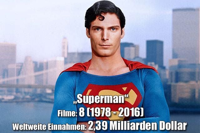 Platz 26 „Superman“ Gesamtes Einspielergebnis (weltweit): 1.521.648.737 $ Durchschnittliches Einspielergebnis (weltweit): 253.608.123 $ FILME (6): „Superman“: 300.200.000 $ „Superman II“: 108.185.706 $ „Superman III“: 59.950.624 $ „Superman IV“: 11.227.824 $ „Superman Returns“: 374.085.065 $ „Man Of Steel“: 667.999.518 $