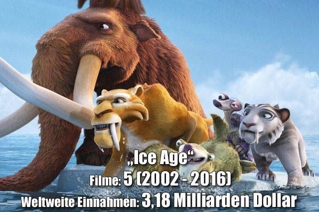 Platz 14 „Ice Age“ Gesamtes Einspielergebnis (weltweit): 2.777.482.632 $ Durchschnittliches Einspielergebnis (weltweit): 694.370.658 $ FILME (4): „Ice Age“: 386.116.346 $ „Ice Age 2“: 651.899.285 $ „Ice Age 3 - Die Dinosaurier sind los“: 859.701.864 $ „Ice Age 4 - Voll verschoben”: 879.765.137 $