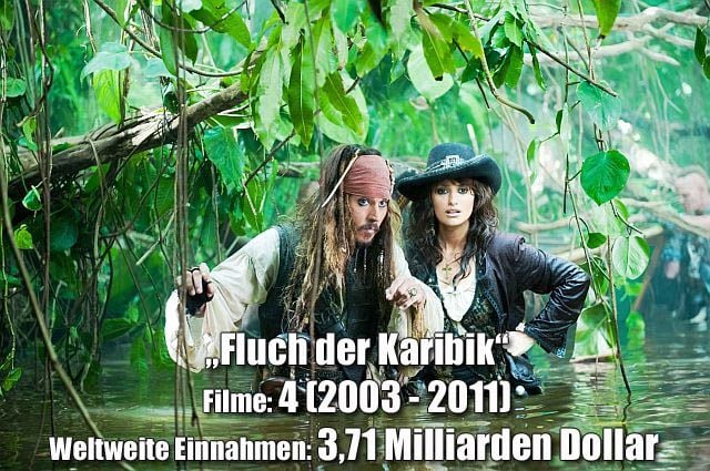 Platz 8 „Fluch der Karibik“ Gesamtes Einspielergebnis (weltweit): 3.700.230.290 $ Durchschnittliches Einspielergebnis (weltweit): 925.057.573 $ FILME (4): „Fluch der Karibik“: 634.954.111 $ „Pirates Of The Caribbean - Fluch der Karibik 2“: 1.060.615.812 $ „Pirates Of The Caribbean - Am Ende der Welt“: 960.996.492 $ „Pirates Of The Caribbean - Fremde Gezeiten“: 1.043.663.875 $