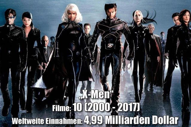 Platz 12 „X-Men“ Gesamtes Einspielergebnis (weltweit): 3.054.423.278 $ Durchschnittliches Einspielergebnis (weltweit): 436.346.182 $ FILME (7): „X-Men“: 296.339.717 $ „X-Men 2“: 407.711.551 $ „X-Men: Der letzte Widerstand“: 459.359.557 $ „X-Men Origins: Wolverine”: 374.825.760 $ „X-Men: Erste Entscheidung”: 355.408.305 $ „Wolverine: Weg des Kriegers”: 416.456.852 $ „X-Men: Zukunft ist Vergangenheit”: 744.321.536 $