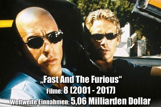 Platz 13 „Fast and the Furious“ Gesamtes Einspielergebnis (weltweit): 2.903.466.573 $ (Stand: 10. April 2015) Durchschnittliches Einspielergebnis (weltweit): 414.780.939 $ (Stand: 10. April 2015) FILME (7): „The Fast and the Furious“: 206.512.310 $ „2 Fast 2 Furious“: 236.220.058 $ „The Fast And The Furious: Tokyo Drift“: 157.794.205 $ „Fast & Furious - Neues Modell. Originalteile.”: 363.064.272 $ „Fast & Furious Five”: 629.927.766 $ „Fast & Furious 6”: 789.952.817 $ „Fast & Furious 7”: 519.995.145 $ (Stand: 10. April 2015)
