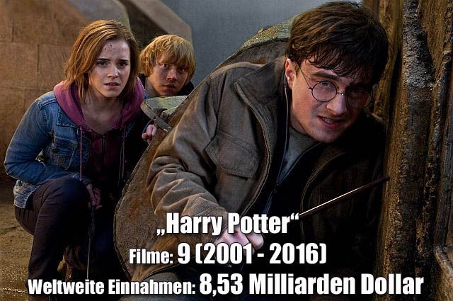 Platz 1 „Harry Potter“ Gesamtes Einspielergebnis (weltweit): 7.709.873.201 $ Durchschnittliches Einspielergebnis (weltweit): 963.734.150 $ FILME (8): „Harry Potter und der Stein der Weisen“: 974.755.373 $ „Harry Potter und die Kammer des Schreckens“: 878.979.634 $ „Harry Potter und der Gefangene von Askaban“: 796.688.549 $ „Harry Potter und der Feuerkelch“: 896.911.078 $ „Harry Potter und der Orden des Phönix“: 942.943.935 $ „Harry Potter und der Halbblutprinz“: 935.083.689 $ „Harry Potter und die Heiligtümer des Todes Teil 1“: 956.399.711 $ „Harry Potter und die Heiligtümer des Todes Teil 2“: 1.328.111.232 $