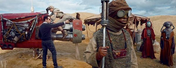 J.J. Abrams gibt Daisy Ridley Anweisungen für eine Szene, in der ihre Figur Rey mit ihrem Speeder über einen geschäftigen Marktplatz auf dem Planet Jakku fliegt.
