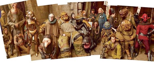 Galaktische Reisende, Schmuggler und anderes Gesindel in der Haupthalle des Schlosses von Piratin Maz Kanata.