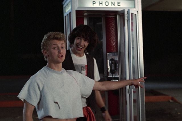 Um möglichst wenig Aufsehen zu erregen, wenn man aus dem Jahr 2688 zurück in die 1980er springt, tarnen die Menschen der Zukunft ihre Zeitmaschinen kurzerhand als ganz alltägliche Telefonzelle (ja, ihr lieben Unterdreißigjährigen, die Dinger standen vor gar nicht allzu langer Zeit noch an jeder Straßenecke). Für Bill (Alex Winter) und Ted (Keanu Reeves) kommt die Telefonzelle zumindest gerade recht, um mit ihrer Hilfe historische Personen für ein Geschichtsreferat der besonderen Art einzusammeln.