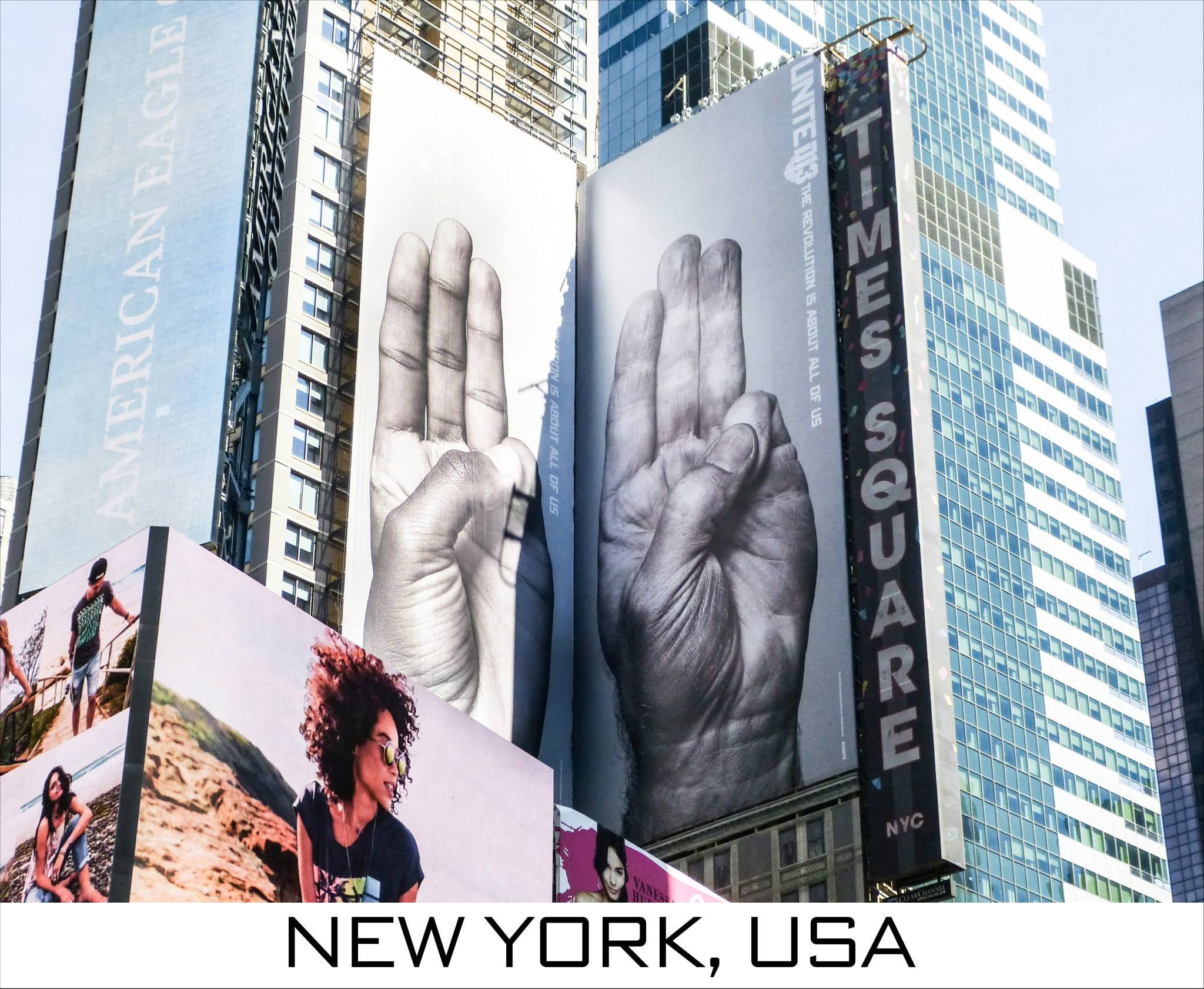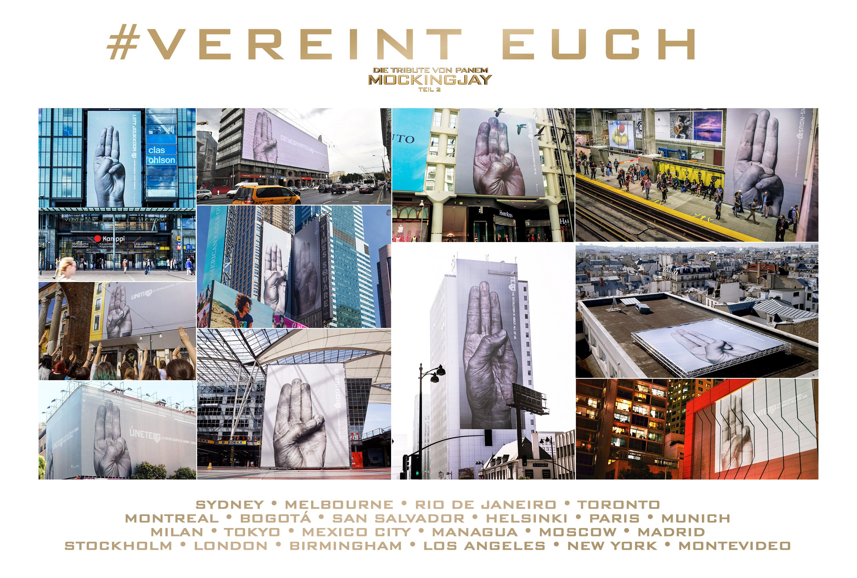 Werbung auf unterschiedlichen Kanälen: Nachdem kürzlich der erste Teaser-Trailer zu „Die Tribute von Panem – Mockingjay Teil 2“ veröffentlicht wurde, sind Bilder zum Panem-Finale nun auch für alle Menschen sichtbar, die unterwegs ab und an vom Smartphone hochschauen. Wie ihr in der Bildergalerie in Ausschnitten seht, hängen die Plakate mit dem Drei-Finger-Gruß weltweit. Insgesamt 18 Länder wurden entsprechend bestückt, an prominenten Orten wie dem Times Square in New York oder dem Westfield Centre in London.