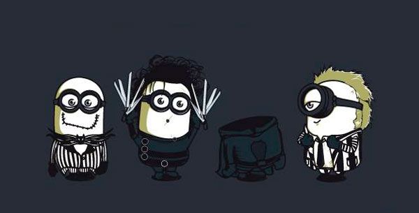 Minion Jack, Minion mit den Scherenhänden, der kopflose Minion und Minion Beetlejuice aus "Nightmare before Christmas", "Edward mit den Scherenhänden", "Sleepy Hollow" und "Beetlejuice"