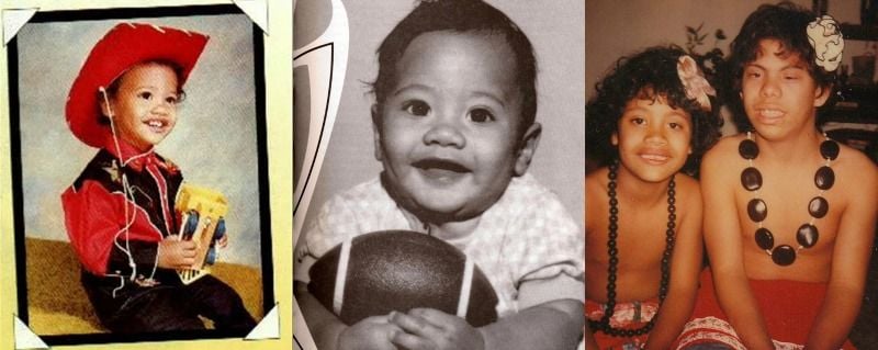 Dwayne Johnson als Baby und mit traditionellem hawaiianischen Schmuck.