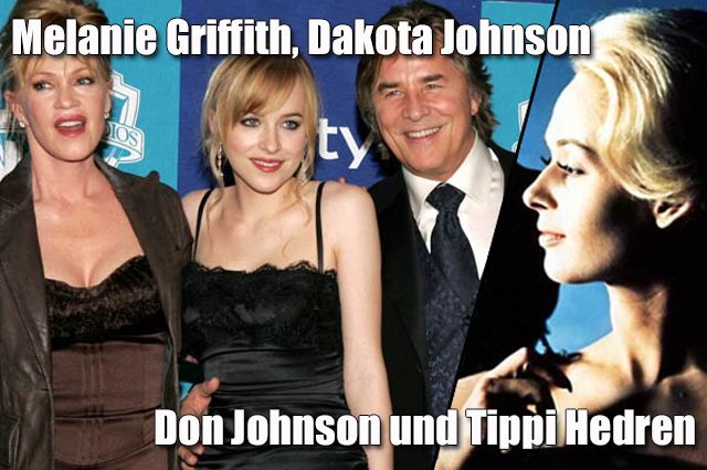 Melanie Griffith („Die Waffen der Frauen“, „Lolita“) hat ebenfalls eine berühmte Mutter, Hitchcock-Mimin Tippi Hedren („Die Vögel“, „Marnie“), ihr verstorbener Vater Peter Griffith spielte 1978 in John Carpenters Kultfilm „Halloween“. Melanie Griffiths gemeinsame Tochter mit Don Johnson („Miami Vice“, „Tin Cup“) ist „50 Shades of Grey“-Star Dakota Johnson („Black Mass“), ihr Stiefvater Antonio Banderas.