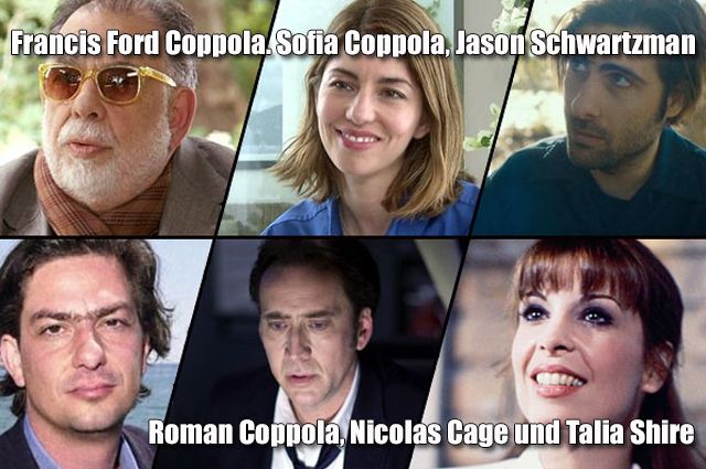 Der Coppola-Clan ist eine der größten Kreativen-Familien in Hollywood. Das Oberhaupt ist Meisterregisseur Francis Ford Coppola („Der Pate“-Trilogie, „Apocalypse Now“). Der Versuch, seiner Tochter Sofia Coppola in „Der Pate III“ eine Schauspielkarriere zu ermöglichen, scheiterte kläglich. Dafür stellte sie sich anschließend selbst als hervorragende Regisseurin („Lost In Translation“, „The Virgin Suicides“) heraus. Sofias älterer Bruder Roman Coppola schrieb die Wes-Anderson-Filme „Moonrise Kingdom“ und „Darjeeling Limited“, erlitt aber mit seinem misslungenen Regiedebüt „Charlies Welt“ Schiffbruch. Dann gibt es da auch noch Sofias Cousin Jason Schwartzman („Rushmore“, „Grand Budapest Hotel“), ehemaliges Mitglied der Band Phantom Planet und Leibschauspieler von Kult-Regisseur Wes Anderson. Schwartzmans Mutter ist die Schauspielerin Talia Shire, die durch „Der Pate“ (inszeniert von ihrem Bruder Francis Ford Coppola) und als Adrian in den „Rocky“-Filmen berühmt wurde. Zu guter Letzt gibt es auch noch Francis Ford Coppolas Neffen Nicholas Kim Coppola, besser bekannt unter seinem Künstlernamen Nicolas Cage („Leaving Las Vegas“).