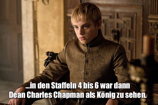 Ab Staffel 4 wurde Callum Wharry dann von Dean Charles Chapman ersetzt, einem etwas älteren, erfahreneren Schauspieler, der der Rolle des neuen König besser gewachsen war. In einer Nebenrolle war Dean außerdem sogar schon als Tommens Cousin Martyn Lannister in Staffel 3 zu sehen.