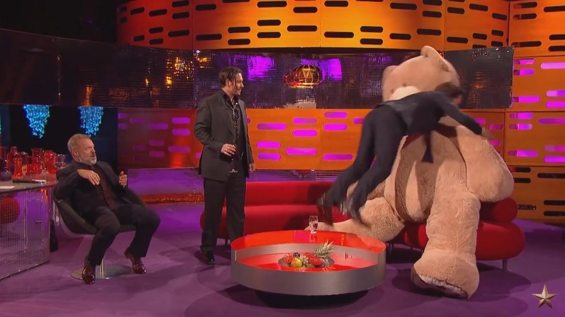 Doch dank dem beliebten britischen Talkmaster Graham Norton gibt es nun endlich Nachschub! In seiner Show ließ er Cumberbatch einfach weitere Otter-Fotos mimisch nachstellen – und bei einem davon machte sogar der die ganze Zeit ziemlich skeptisch dreinschauende Johnny Depp mit. Aber so genial-lustig die Bilder auch geworden sind, der beste Moment ist doch der, in dem Depp voller nicht gespielter Panik vor einem riesigen Teddybär auf die andere Seite des Studios flüchtet!