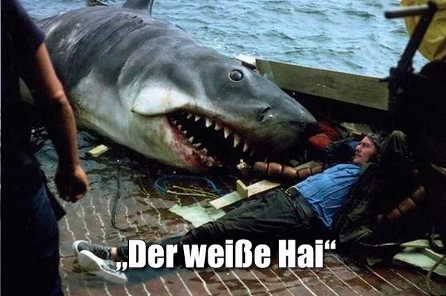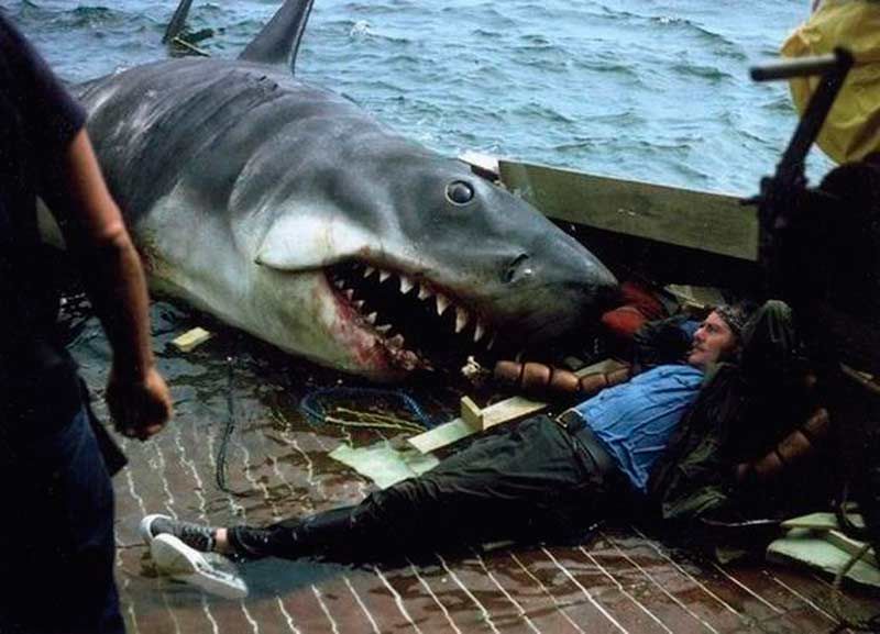 Robert Shaw ganz friedlich neben seinem Erzfeind am Set von „Der weiße Hai“.
