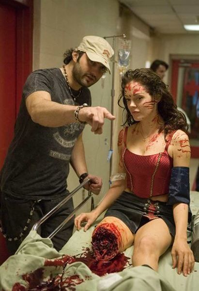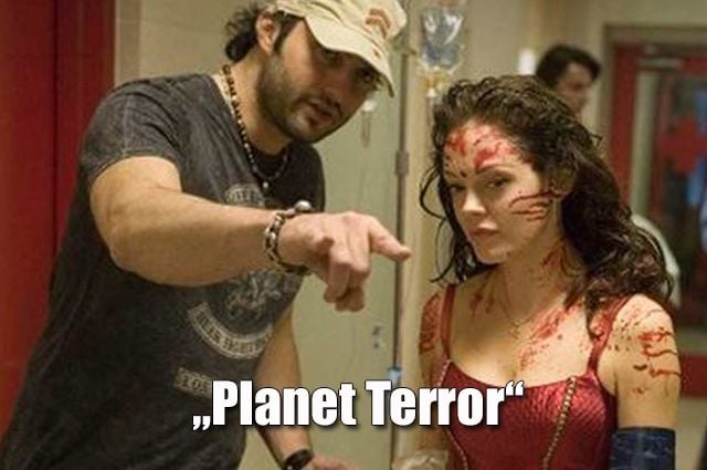 Bein ab, aber trotzdem bester Laune – Robert Rodriguez und Rose McGowan am Set von „Planet Terror“.
