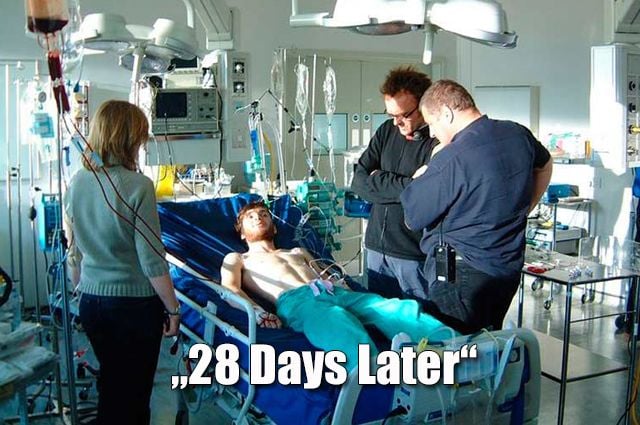 Danny Boyle spricht mit seinem Hauptdarsteller Cillian Murphy am Set von „28 Days Later“.