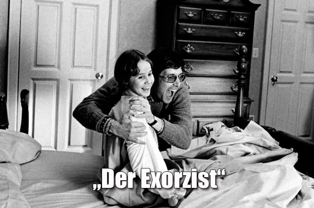Regisseur William Friedkin umarmt die „besessene“ Linda Blair am Set von „Der Exorzist“.