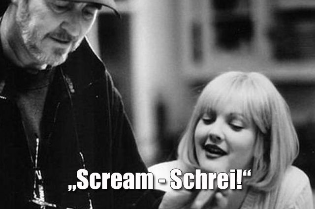 Wes Craven und Drew Berrymore besprechen die Messerwahl am Set von „Scream – Schrei!“.