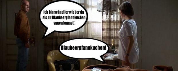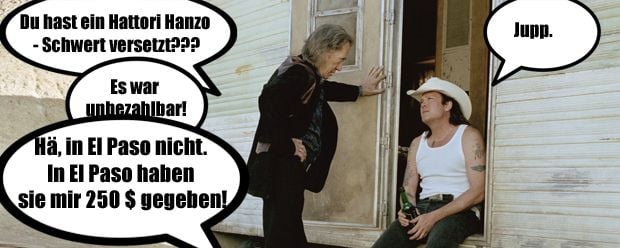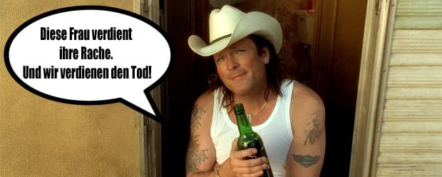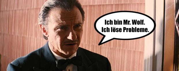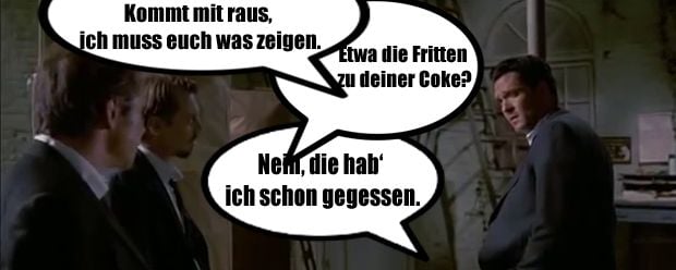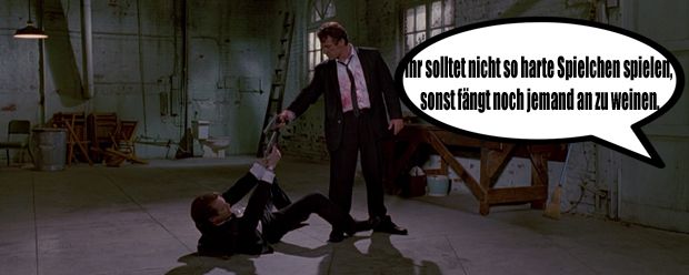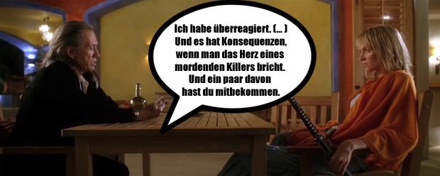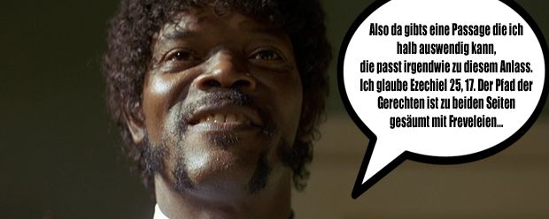Also da gibts eine Passage die ich halb auswendig kann, die passt irgendwie zu diesem Anlass. Ich glaube Ezekiel 25, 17. »Der Pfad der Gerechten ist zu beiden Seiten gesäumt mit Freveleien der Selbstsüchtigen und der Tyrannei böser Männer. Gesegnet sei der, der im Namen der Barmherzigkeit und des guten Willens die Schwachen durch das Tal der Dunkelheit geleitet. Denn er ist der wahre Hüter seines Bruders und der Retter der verlorenen Kinder. Und da steht weiter ich will große Rachetaten an denen vollführen, die da versuchen meine Brüder zu vergiften und zu vernichten, und mit Grimm werde ich sie strafen, daß sie erfahren sollen: Ich sei der Herr, wenn ich meine Rache an ihnen vollstreckt habe.