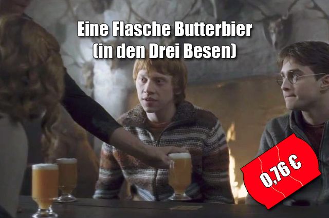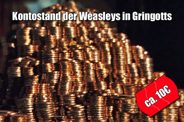 Wie jeder fleißige „Harry Potter“-Leser weiß, entspricht eine (goldene) Galleone 17 (silbernen) Sickel oder 493 (bronzenen) Knuts. In einem Interview mit Comic Relief hat J.K. Rowling einmal geäußert, dass eine Galleone je nach Wechselkus ungefähr 5 £ wert ist. Legt man den aktuellen Wechselkurs von Pfund zu Euro zugrunde, folgt daraus in etwa: