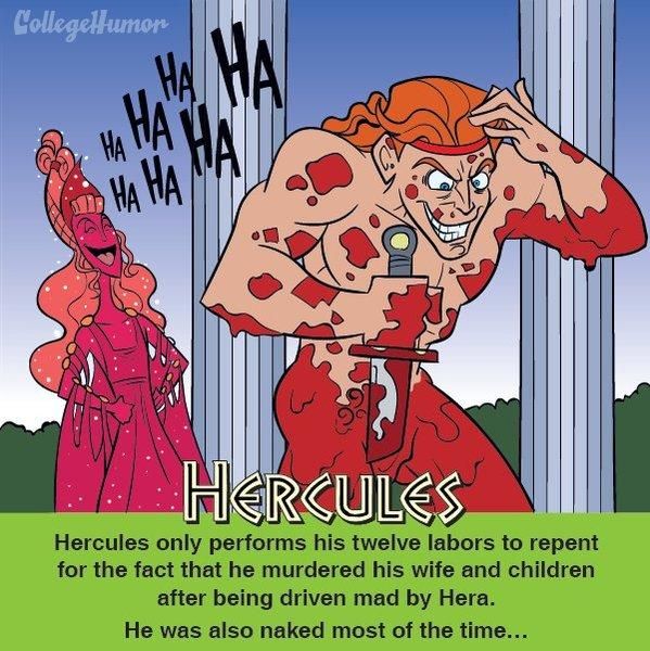 Die Disney-Version: In „Hercules“ erfährt die Titelfigur, dass er eigentlich der Sohn der Götter Zeus und Hera ist und als Baby von Hades‘ bösem Bruder Hades verschleppt wurde. Obwohl er unter normalen Menschen aufgewachsen ist, zieht es Hercules zurück in den Olymp, wo seine wahren Eltern leben. Dorthin darf er aber nur, wenn er zuvor große Aufgaben bewältigt und so beweist, dass er ein wahrer Held ist. Und so grausam war's vorher: Von klein auf muss sich Herkules, Sohn des fremdgehenden Göttervaters Zeus und der menschlichen Alkmene, mit der eifersüchtigen Frau seines Vaters herumschlagen. Eines Tages überkommt ihn durch Heras böses Zutun sogar der Wahnsinn und ohne wirklich zu wissen, was er tut, erschlägt er seine Frau Megara und ihre drei gemeinsamen Kinder. Um seine schrecklichen Taten zu sühnen, muss er nun zwölf Arbeiten bewältigen – und zwar die meiste Zeit über vollkommen nackt.
