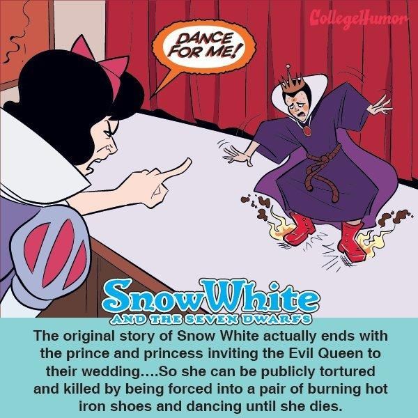 Die Disney-Version: Die eifersüchtige Stiefmutter kann es in „Schneewittchen und die sieben Zwerge“ nicht ertragen, dass Schneewittchen schöner und anmutiger ist als sie. Deshalb beauftragt sie einen Jäger, der dem Mädchen den Garaus machen soll. Der lässt das Mädchen jedoch aus Mitleid ziehen. Irgendwann stöbert die Stiefmutter Schneewittchen in einer Zwergen-WG auf und füttert sie mit einem vergifteten Apfel. Ein Kuss des Prinzen kann den Zauber aber brechen und Schneewittchen erwacht wieder zum Leben… Und so grausam war's vorher: Um ganz sicher zu sein, dass Schneewittchen von dem Jäger getötet worden ist, verlangt sie als Beweis die Leber und das Herz des Mädchens, die sie außerdem verspeisen möchte. Der gutmütige Jäger servierte der eifersüchtigen Königin aber stattdessen die Organe eines Wildschweins. Am Ende ist es hier auch nicht der Kuss des Prinzen, der Schneewittchen wieder auferstehen lässt, stattdessen lässt der Prinz nur ihren gläsernen Sarg fallen, woraufhin Schneewittchen das in ihrem Hals steckende Apfelstückchen wieder herauswürgt. Die böse Stiefmutter bekommt am Ende auch noch ordentlich ihr Fett weg: Man zwingt sie, auf der Hochzeit von Schneewittchen und dem Prinzen in glühenden Schuhen zu tanzen, bis sie Tod umfällt.