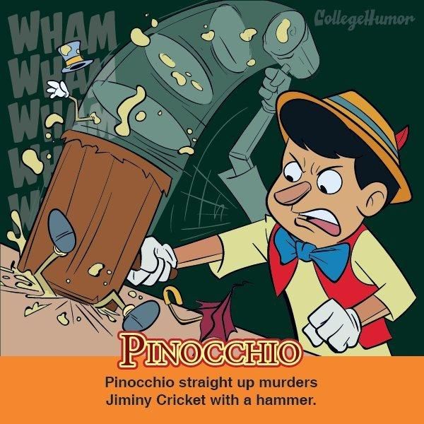 Die Disney-Version: Der Tischler Geppetto wünscht sich in „Pinocchio“ einen Sohn. Also schnitzt er sich eine Holzmarionette, die er Pinocchio nennt und die durch den Zauber einer Fee zum Leben erwacht. Die kleine Grille Jiminy soll auf Pinocchio aufpassen, denn der kleine Holzkopf gerät von einer verfänglichen Situation in die nächste. Am Ende besinnt sich Pinocchio eines besseren und rettet seinen Vater aus dem Bauch eines Wals. Die Fee verwandelt ihn als Belohnung in einen echten Jungen aus Fleisch und Blut… Und so grausam war's vorher: In den Geschichten des Italieners Carlo Collodi, der die Erzählungen von dem hölzernen Bengel schrieb, geht es etwas ruppiger zur Sache: Um den lästigen Ratschlägen von Jiminy zu entgehen, haut Pinocchio die arme Grille einfach mit einem Hammer platt. Anschließend lässt er sich mit schlimmen Gesellen ein, landet im Gefängnis und entkommt nur knapp dem Tode.