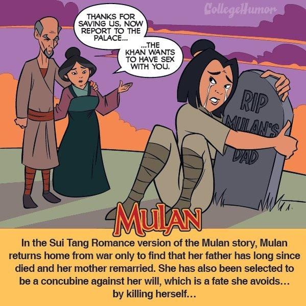 Die Disney-Version: Als der Kaiser erfährt, dass Mulan in Wahrheit eine Frau ist und sich die ganze Zeit nur als Mann ausgegeben hat, ehrt er die tapfere Kriegerin und Mulan wird in ganz Peking gefeiert. Nun kann das Mädchen endlich nach Hause zu ihrer Familie zurückkehren und ihr Vater schließt sie überglücklich und stolz in seine Arme. Und so grausam war's vorher: In der chinesischen Ballade, die die Vorlage zu „Mulan“ bildet, nimmt alles einen ganz anderen, viel tragischeren Verlauf. Denn dort erfährt Mulan bei ihrer Rückkehr, dass ihr Vater seit Langem tot ist und ihre Mutter längst einen anderen Mann geheiratet hat. Auch wird sie zu allem Übel auch noch zur Konkubine des Khans erwählt und sieht nur einen Ausweg, ihrem Schicksal zu entkommen: Sie begeht Selbstmord!
