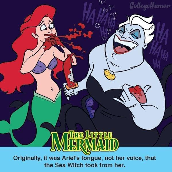 Die Disney-Version: In „Arielle, die Meerjungfrau“ (1989) verliebt sich die Titelheldin in den Menschen Eric. Um ihn für sich zu gewinnen, geht sie einen Pakt mit der Meerhexe Ursula ein: Sie tauscht ihre Stimme gegen menschliche Beine, wobei sie innerhalb von drei Tagen einen Kuss von einem Prinzen bekommen muss, ansonsten verliert Arielle neben ihrer Stimme auch noch ihre Seele. Am Ende schenkt Vater Triton ihr auf Dauer eine menschliche Gestalt und gibt ihr außerdem ihre Stimme zurück… Und so grausam war's vorher: Die Geschichte von der kleinen Meerjungfrau basiert auf der mythologischen Figur der Undine und wird seit Jahrhunderten immer wieder literarisch verarbeitet. Die bekannteste (und auch nicht weiter schlimme) Version stammt von Hans Christian Andersen. Noch ältere Geschichten von der kleinen Meerjungfrau sind hingegen zum Teil extrem brutal: So wird der Meerjungfrau hier nicht nur die Stimme genommen, sondern auch noch direkt die Zunge rausgeschnitten - wie soll sie den Prinzen so überhaupt küssen? Zudem schmerzt jeder ihrer Schritte, als würde sie mit nackten Füßen über Glasscherben laufen. In anderen Fassungen heiratet der Prinz wiederum eine andere Frau, woraufhin die Meerjungfrau zurück in die Unterwasserwelt will - das geht jedoch nur, wenn sie den Prinzen vorher tötet. Da sie das aber nicht übers Herz bringt, stürzt sie sich in die Fluten und verwandelt sich in Schaum.