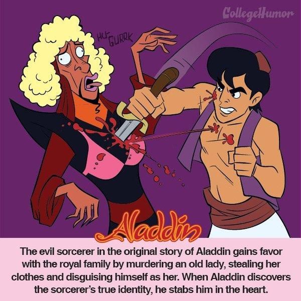 Die Disney-Version: Aladdin und sein Äffchen Abu werden von dem hinterlistigen Jafar gebeten, für ihn eine Lampe aus einer Höhle zu beschaffen. Als er feststeckt, reibt Aladdin an der Lampe und ein Flaschengeist erscheint, der ihm drei Wünsche gewährt. Aladdin will nichts anderes, als die schöne Prinzessin Jasmin zu heiraten, aber Jafar versucht wiederholt, ihm die Lampe doch noch abzuluchsen. Am Ende erlaubt der Sultan Aladdin, seine Tochter zu heiraten – und Jafar wird in die Lampe gesaugt. Und so grausam war's vorher: Aladin (mit einem „d“) ist im Original keinesfalls so ein netter Kerl wie im Disney-Märchen, sondern ein egoistisches Arschloch: Mit seinen drei Wünschen beschafft er sich Reichtum, ein Schloss und die Prinzessin – anschließend tötet er noch einen Zauberer und dessen Bruder, die ihm seine Macht streitig machen wollen. Und so lebt Aladin glücklich und stinkreich bis ans Ende seiner Tage…