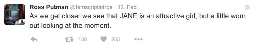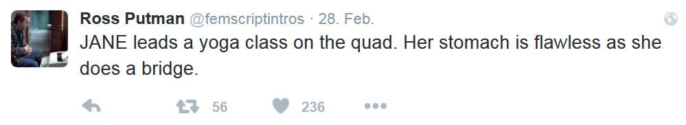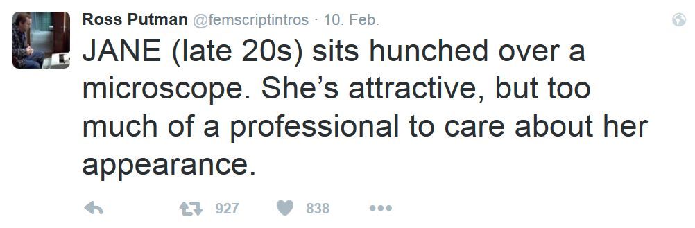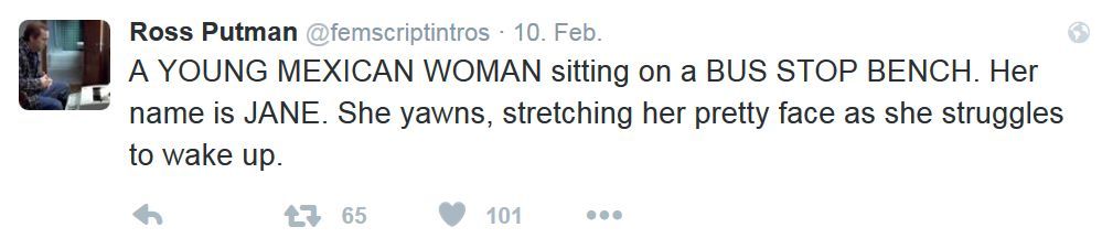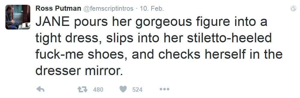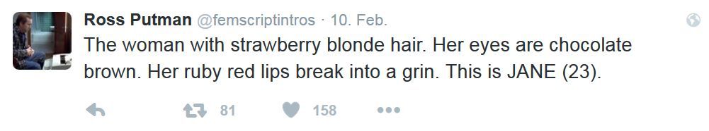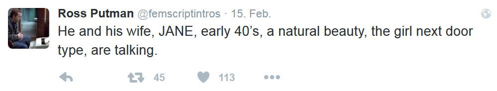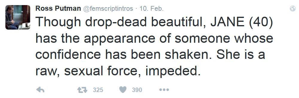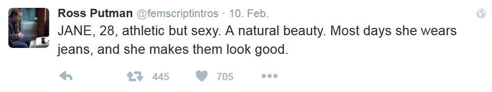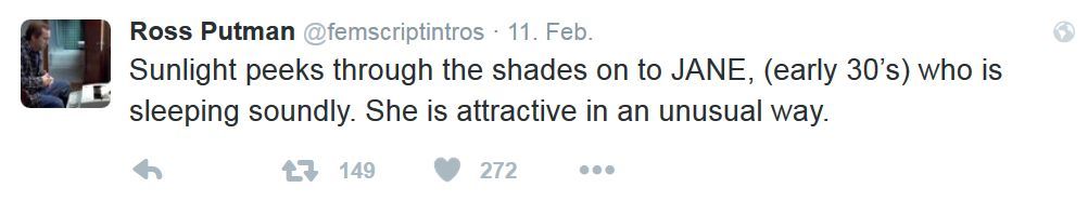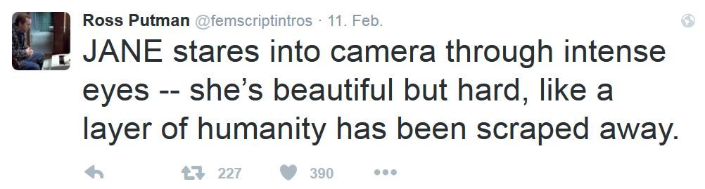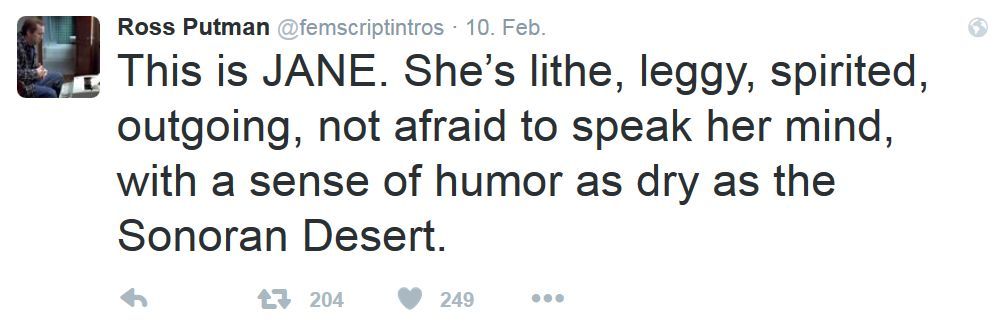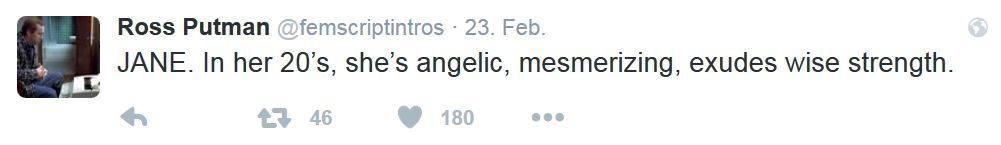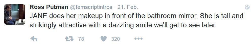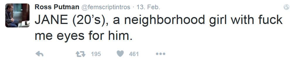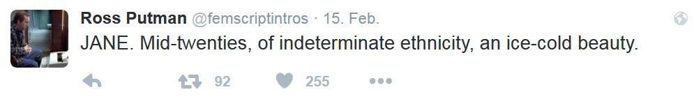 Ross Putman twittert dabei immer die erste Beschreibung der weiblichen Hauptfigur im Skript. Nur eine einzige Änderung nimmt er dabei vor: Er benennt alle Frauen in Jane um, damit niemand allein vom Namen der Figur auf den Film schließen kann.