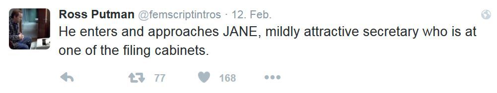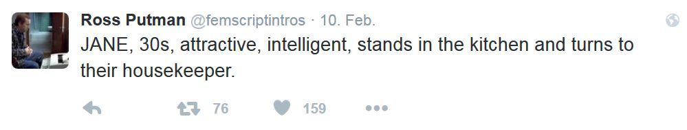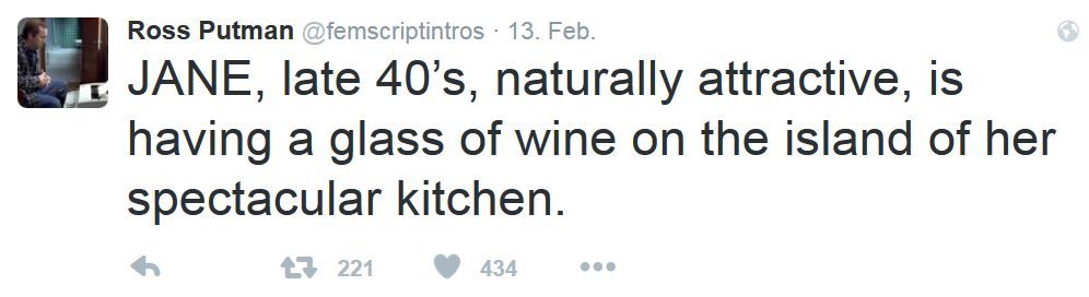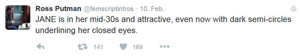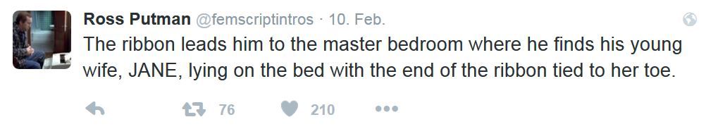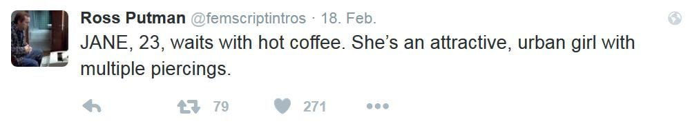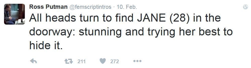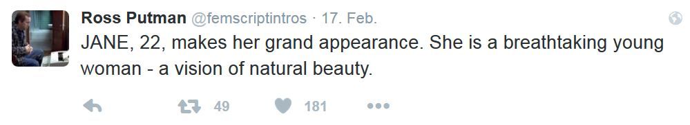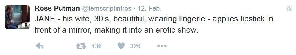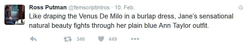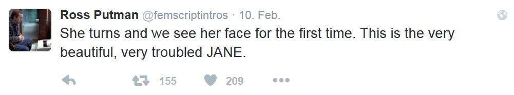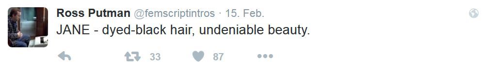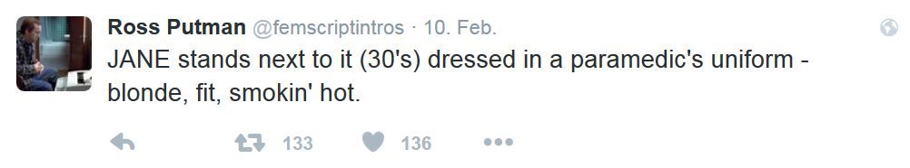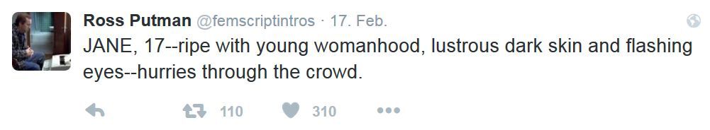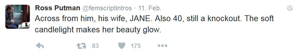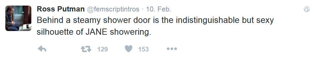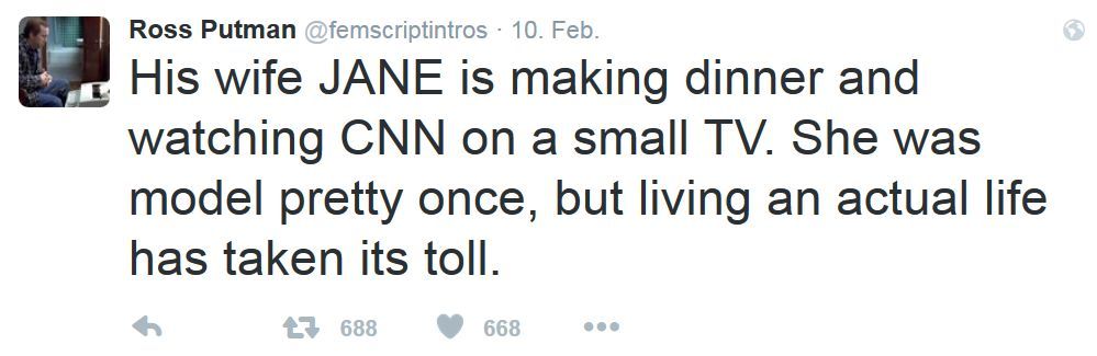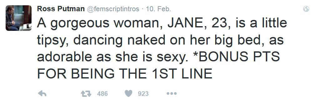 Ross Putman twittert dabei immer die erste Beschreibung der weiblichen Hauptfigur im Skript. Nur eine einzige Änderung nimmt er dabei vor: Er benennt alle Frauen in Jane um, damit niemand allein vom Namen der Figur auf den Film schließen kann.