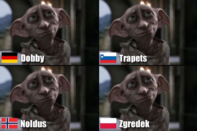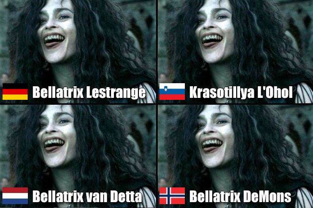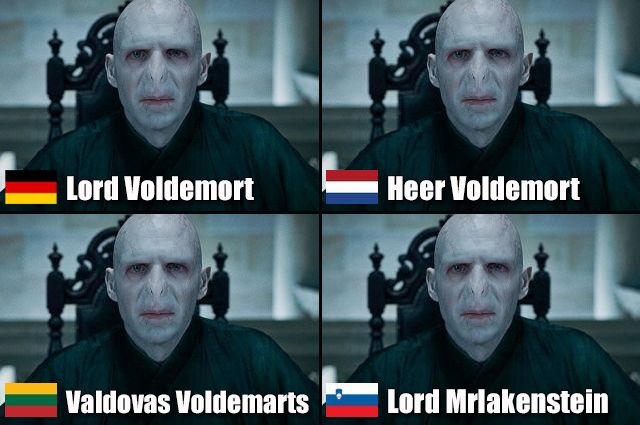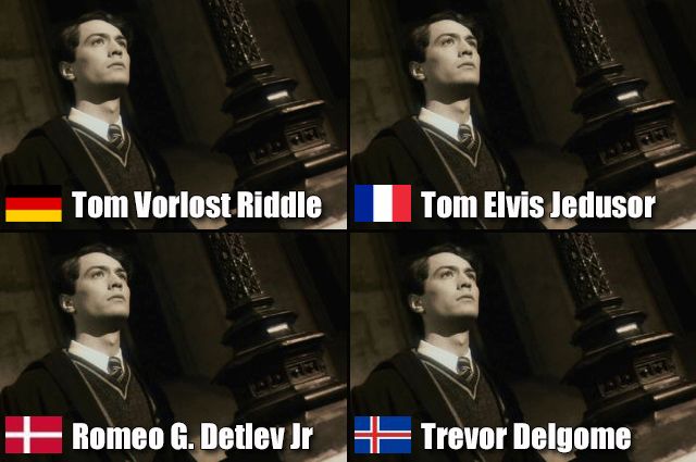 Zum dänischen Namen: Ein Anagramm von "Jeg er Voldemort" (auf Deutsch „Ich bin Voldemort“). Zum französischen Namen: Ein Anagramm von "Je suis Voldemort" (auf Deutsch „Ich bin Voldemort“). Zum isländischen Namen: Ein Anagramm von "Eg er Voldemort" (auf Deutsch „Ich bin Voldemort“).