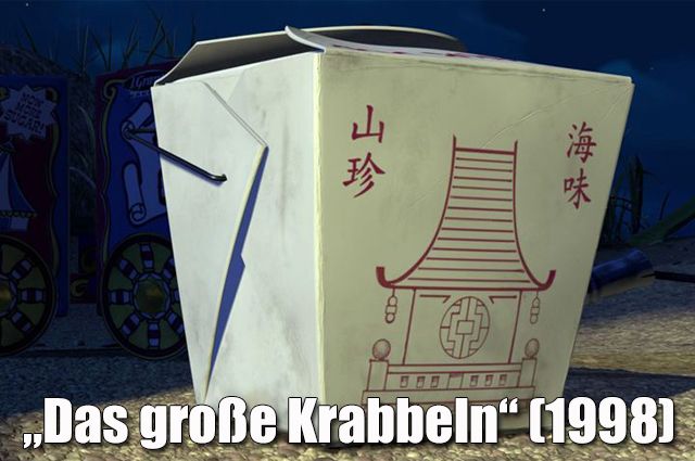 Um genau diese China-Box geht’s! Zum ersten Mal tauchte sie in „Das große Krabbeln“ von 1998 auf. Darin verwendet die Fangschrecke Manny den Karton als Teil seines Zaubertricks.