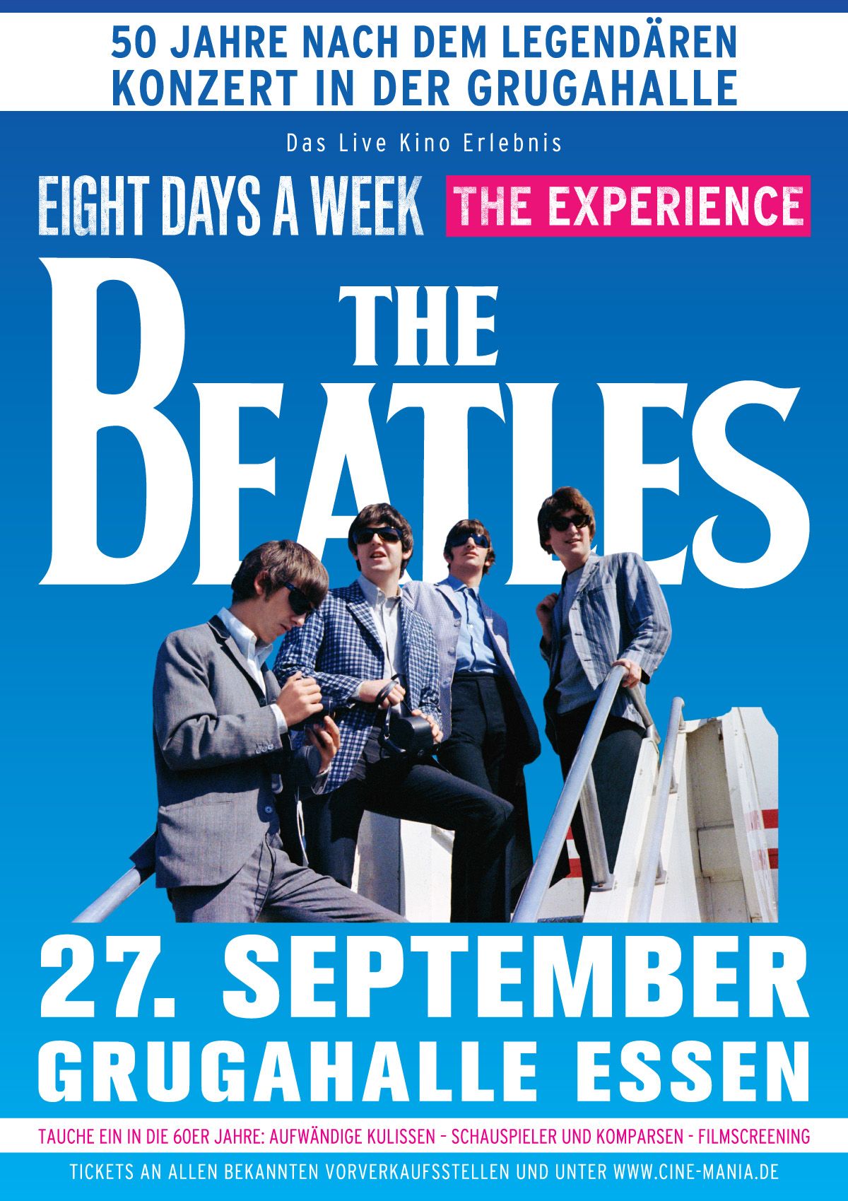 Es ist 50 Jahre her, dass die Beatles das Ruhrgebiet in Ekstase versetzten. In zwei ausverkauften Konzerten in der Essener Grugahalle begeisterten sie ihre Fans. Nun erobern sie 50 Jahre später erneut Essen und die Grugahalle. Im Rahmen des Cine-Mania-Events „The Beatles: Eight Days A Week – The Experience“ wird am 27. September 2016 nicht nur die Dokumentation „The Beatles: Eight Days A Week – The Touring Years“ von Oscarpreisträger Ron Howard („A Beautiful Mind“, „The Da Vinci Code“) gezeigt, sondern es wird ein unkonventionelles, neues Kinoerlebnis um die eigentliche Vorführung herum geschaffen.