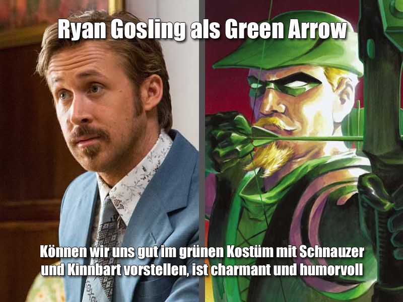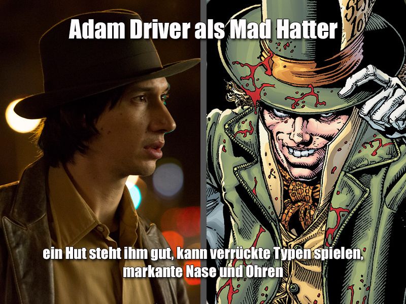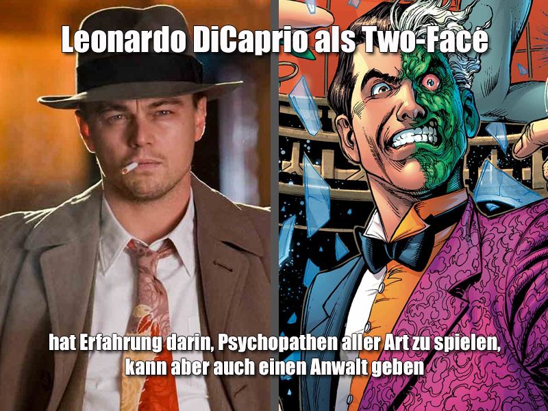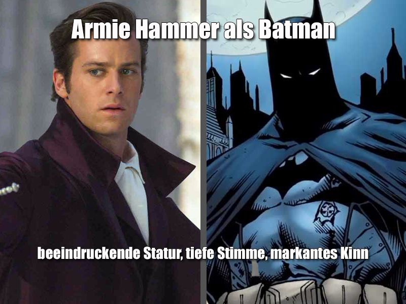 Unsere Ideen haben wir in der obigen Galerie zusammengetragen und dabei nicht nur vermerkt, in welcher Rolle wir den jeweiligen Star gerne sehen würden, sondern auch warum wir finden, dass er in die Rolle passt: Leonardo DiCaprio wäre für uns etwa ein perfekter Two-Face, weil er beide Seiten der Figuren darstellen könnte: Er kann sowohl den besonnenen Anwalt Harvey Dent spielen, als auch den psychopathischen Killer Two-Face, das hat er in anderen Rollen in seiner Karriere zu Genüge bewiesen. Und Armie Hammer wäre für uns der perfekte Batman (und auch George Miller besetzte ihn in seinem gescheiterten „Justice League: Mortal“ einst in dieser Rolle), weil er die richtige Statur (beeindruckend), die richtige Stimme (tief) und das richtige Kinn (markant) hat.