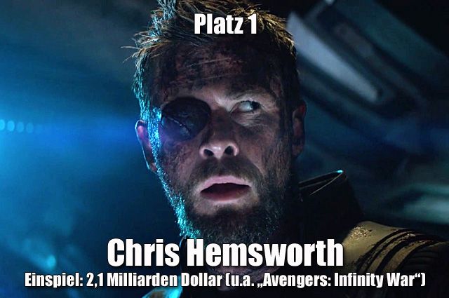 „Thor“ Chris Hemsworth konnte 2018 knapp seine „Infinity War“-Co-Stars Robert Downey Jr., Chris Evans, Scarlett Johansson und Mark Ruffalo ausstechen und gesammelt auf Rang zwei verweisen. Das hat jedoch einen ganz einfachen Grund, schließlich war „Avengers 3“ bei diesen der einzige Film, den sie vergangenens Jahr im Kino hatten, während Hemsworth daneben noch im Kriegsdrama „Operation: 12 Strong“ und dem scharzhumorigen Thriller „Bad Times At The El Royale“ zu sehen war. Die haben beide zwar jeweils weniger als 100 Millionen Dollar eingespielt, bringen Hemsworth in der Summe aber den nötigen Schub, um seine Kollegen hinter sich zu lassen.